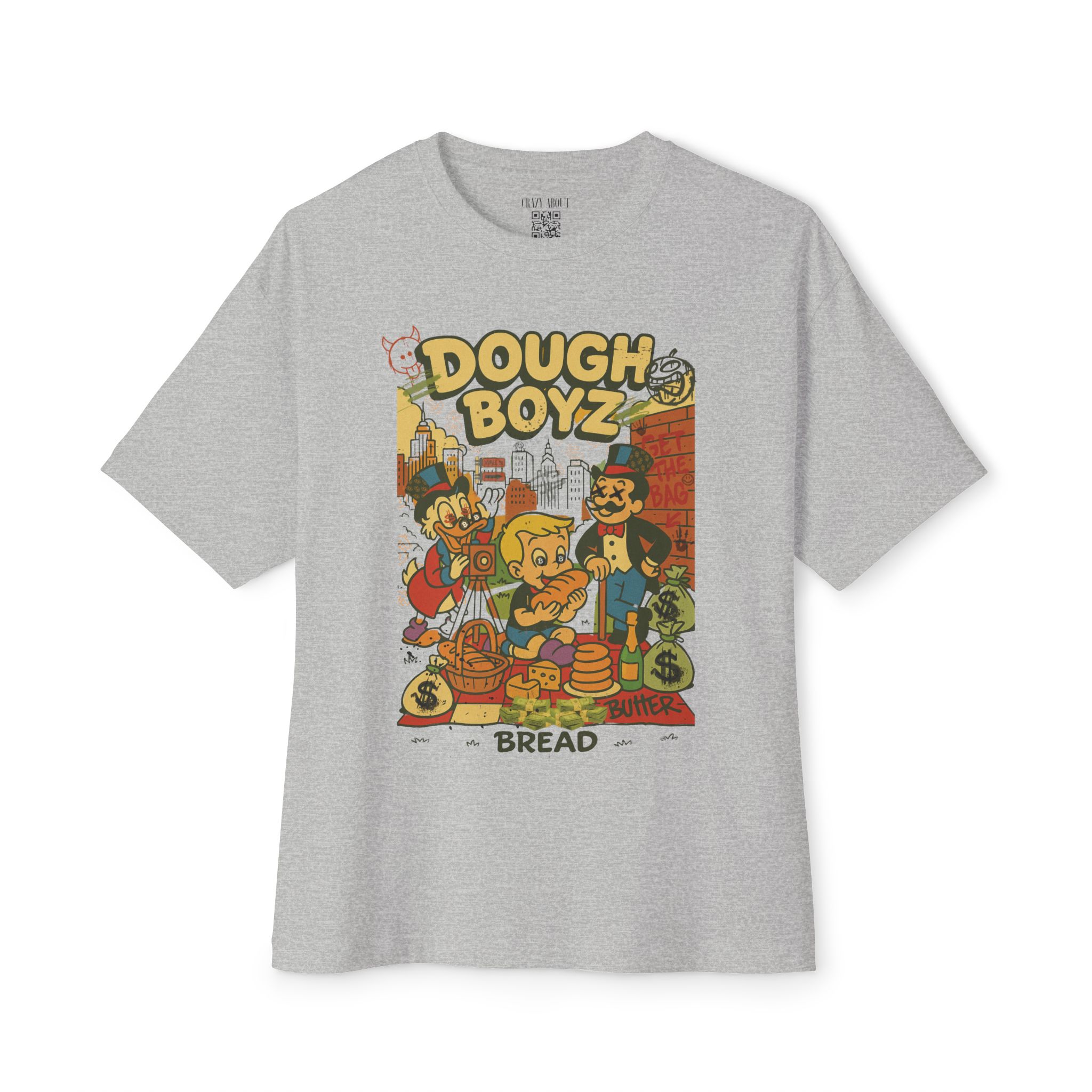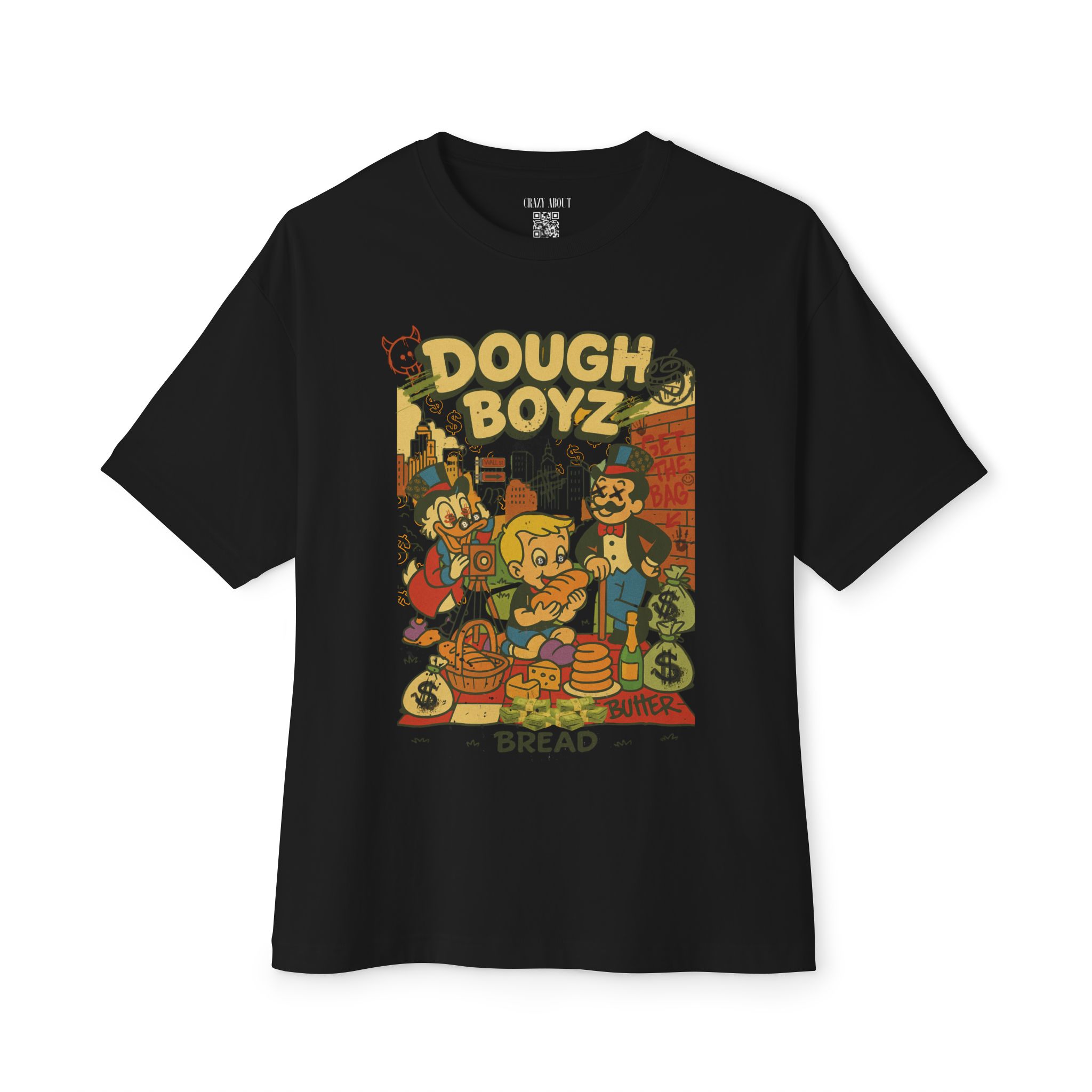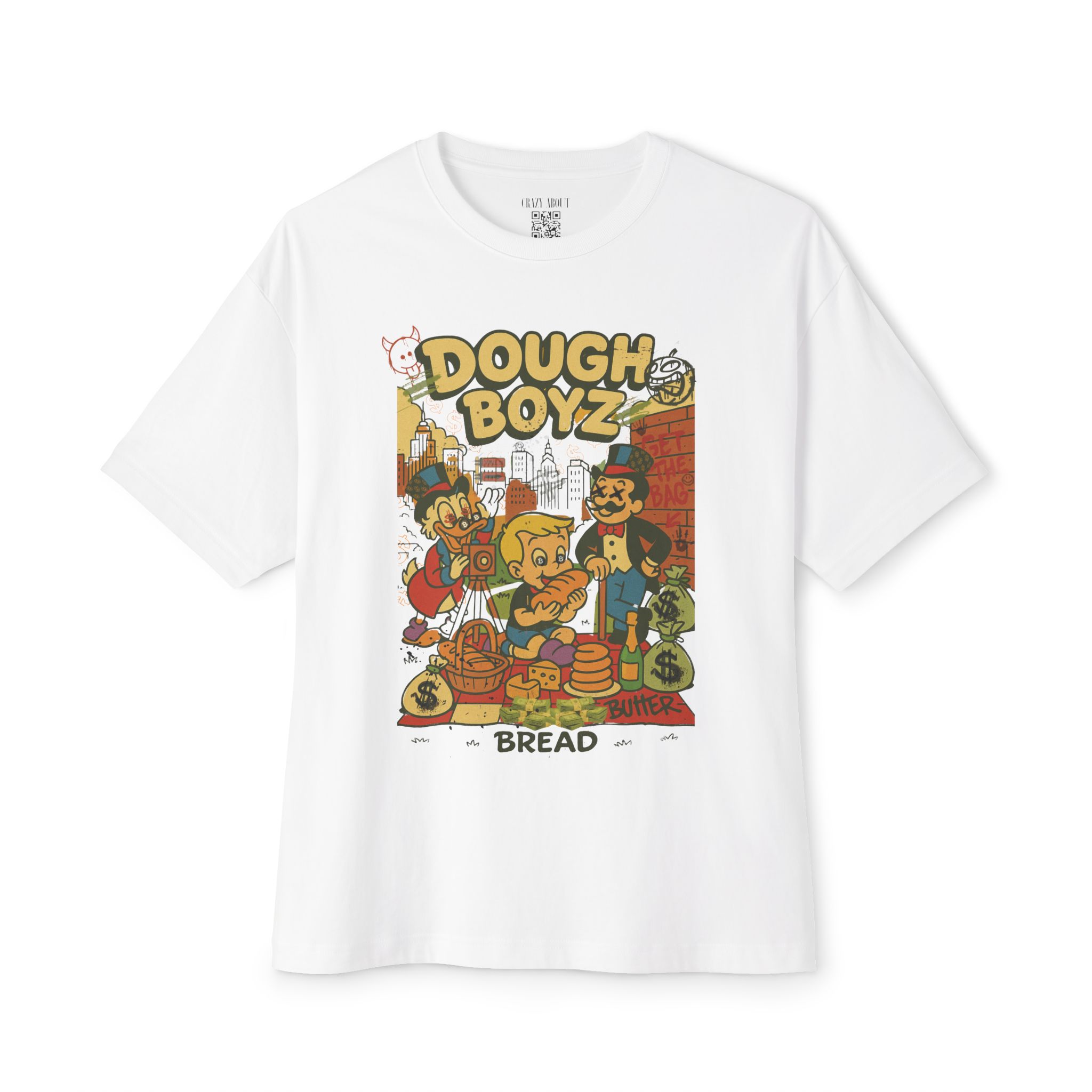 The Dough Boyz Tee is for the streetwear sweet tooth with a bankroll mentality and a bakery complex. It’s giving pop art trap house meets 90s cartoon villainy—where carbs are currency and the drip is always frosted. Whether you’re stacking paper or pastries, this shirt delivers big dough energy with zero nutritional value.