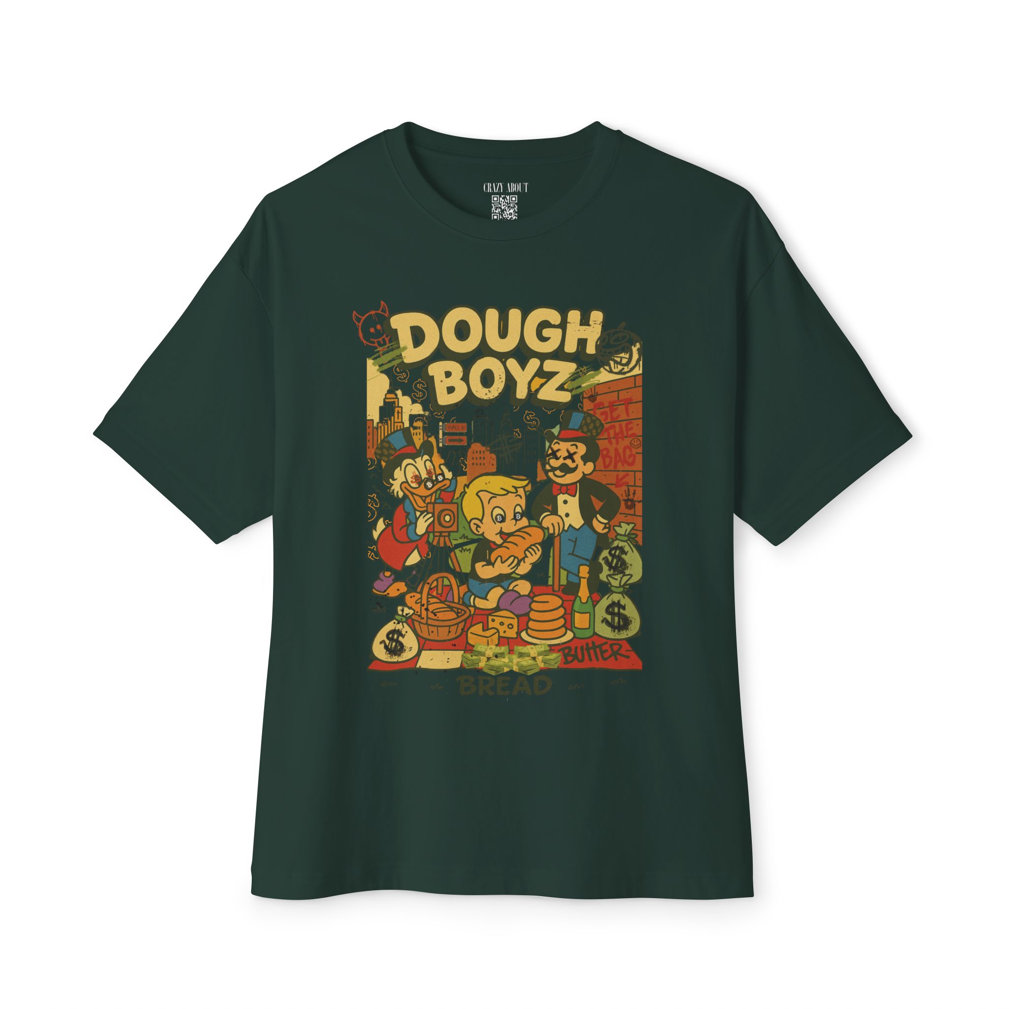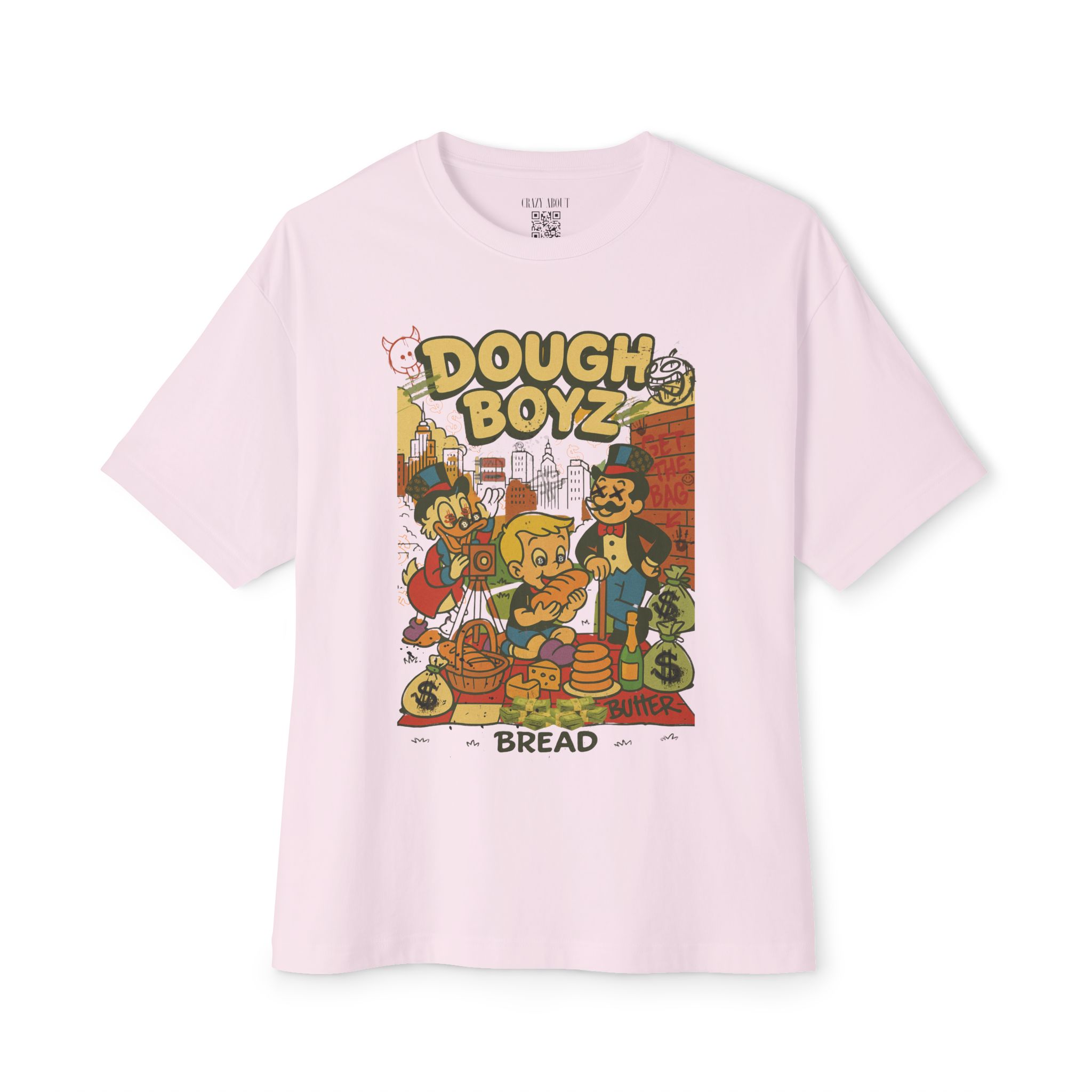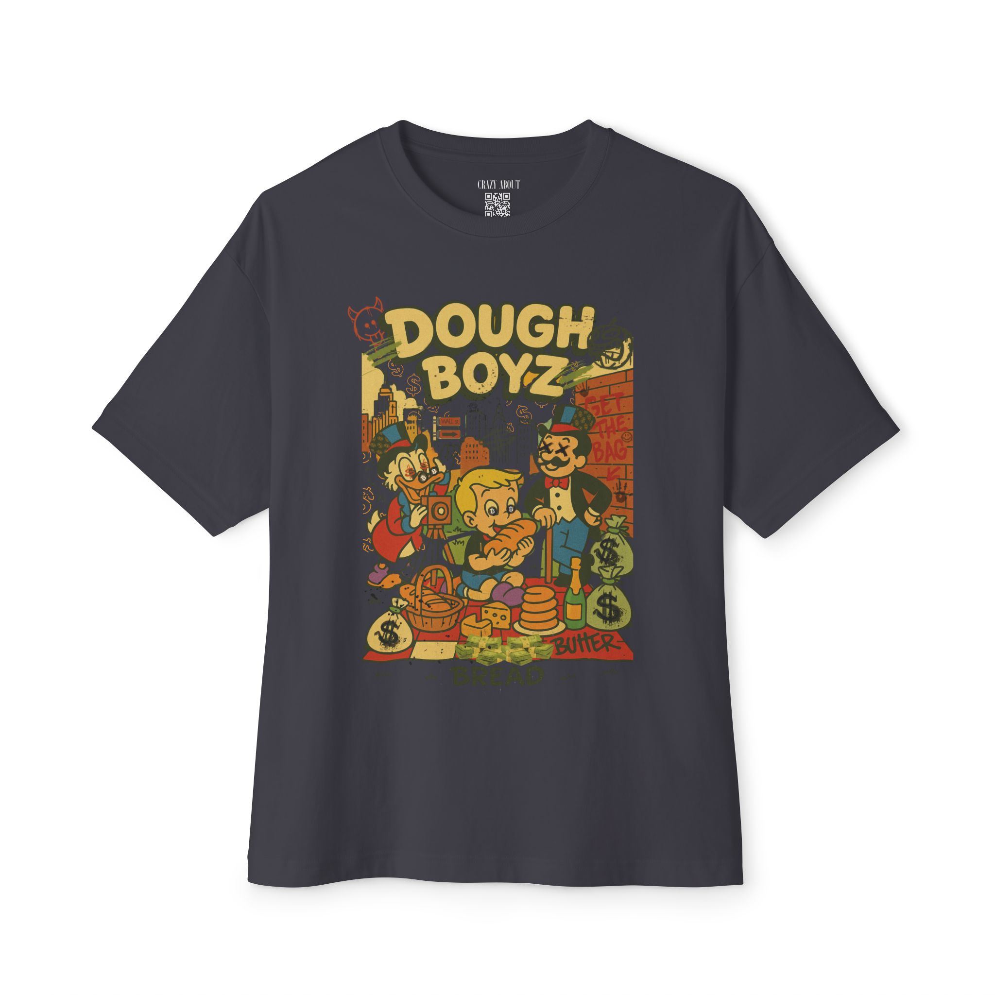 The Dough Boyz Tee is for the streetwear sweet tooth with a bankroll mentality and a bakery complex. It’s giving pop art trap house meets 90s cartoon villainy—where carbs are currency and the drip is always frosted. Whether you’re stacking paper or pastries, this shirt delivers big dough energy with zero nutritional value.