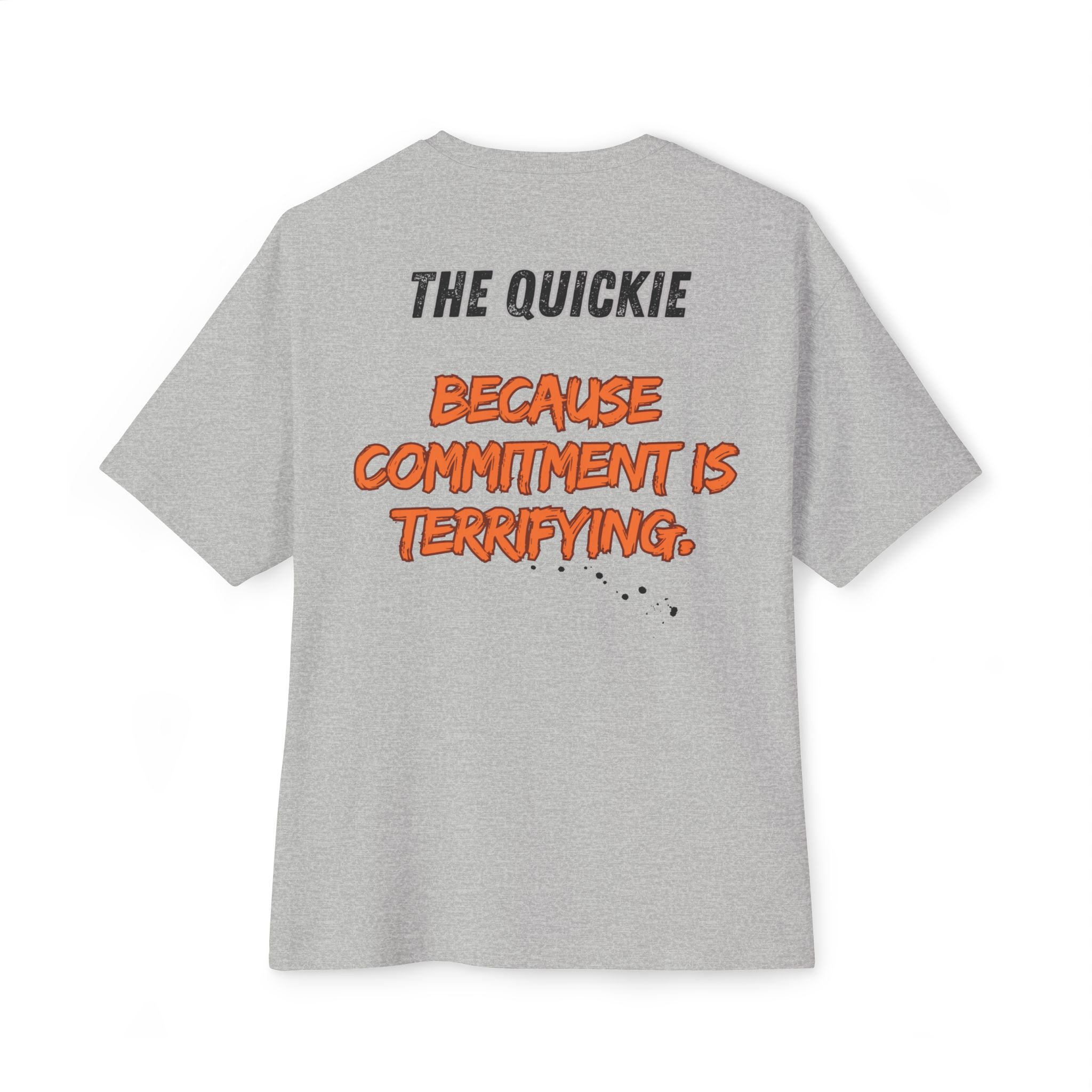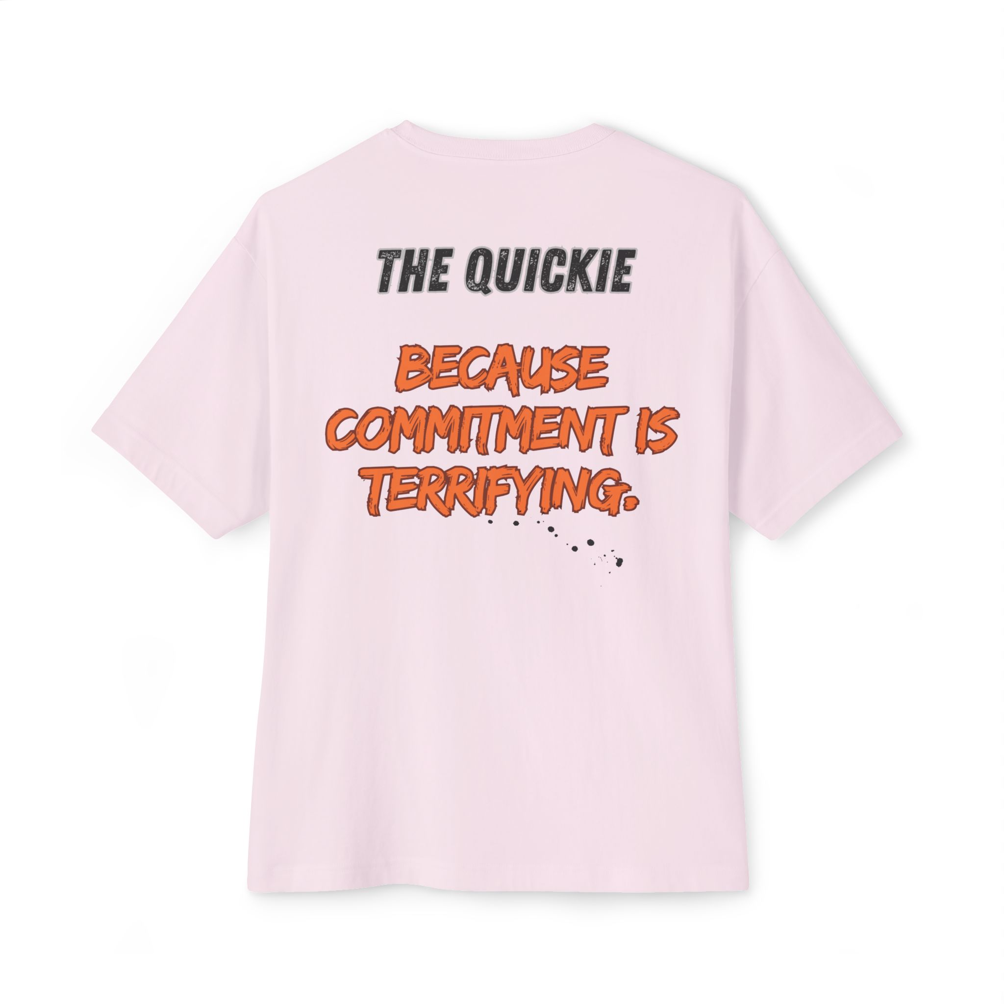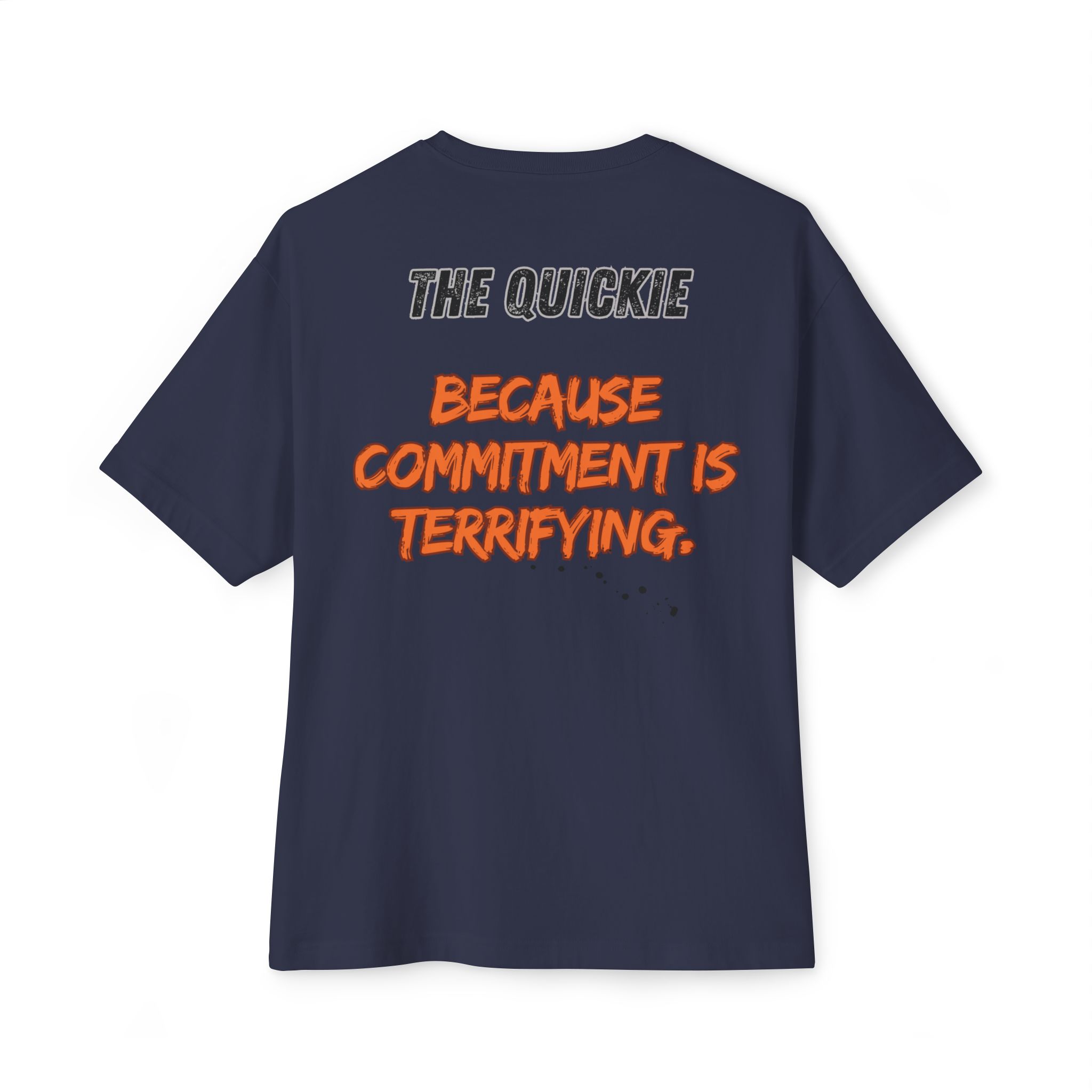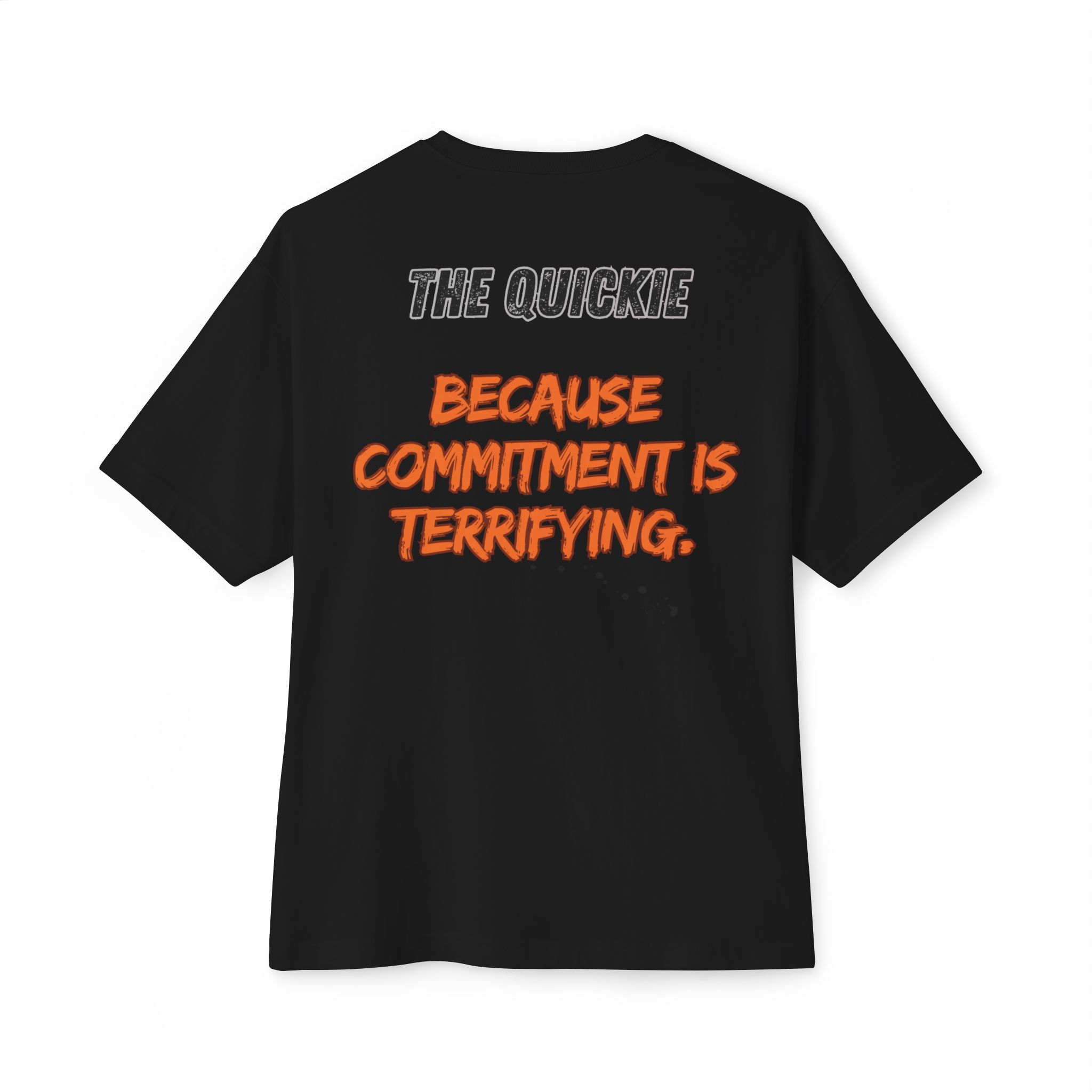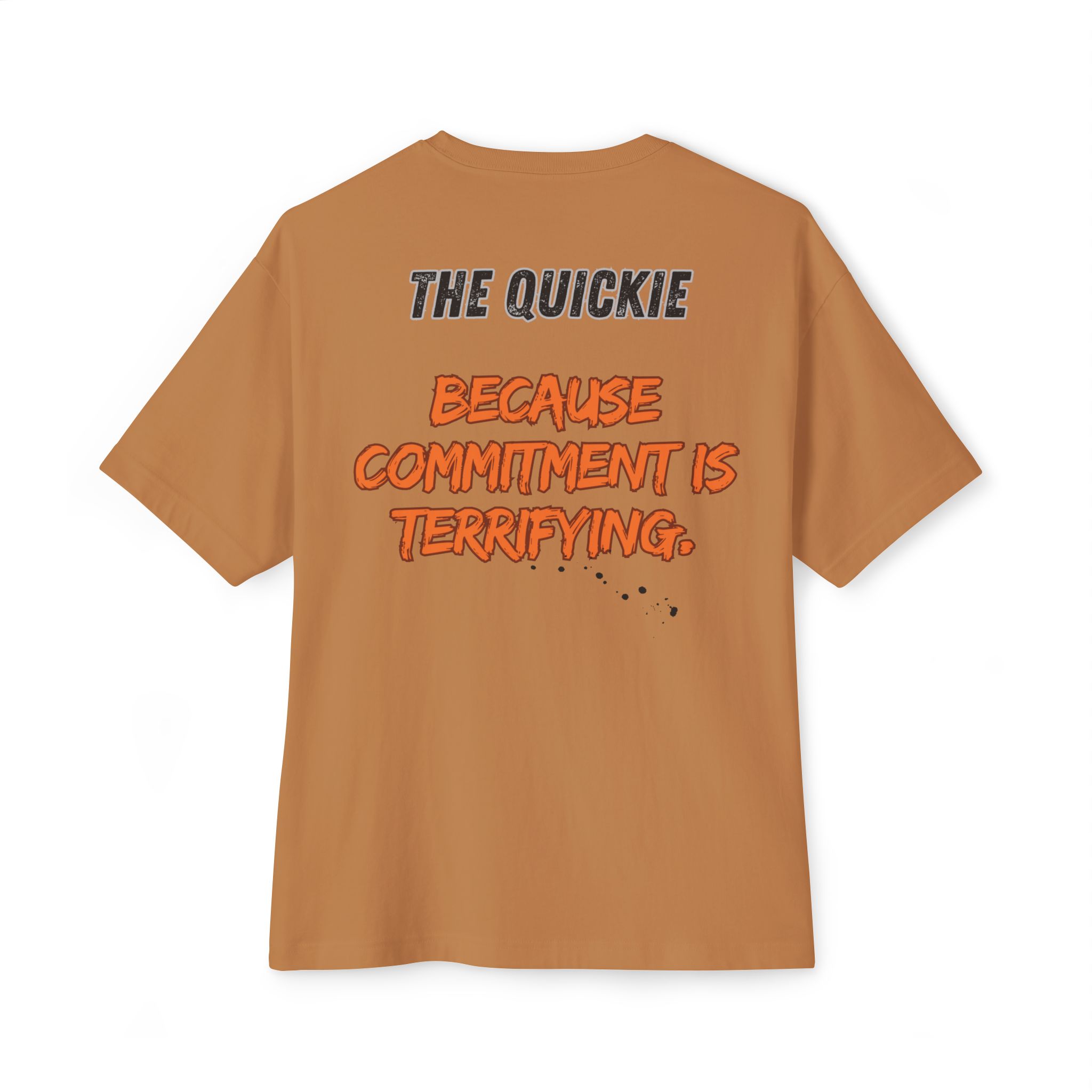 The Quickie Tee is for the emotionally unavailable with great taste in sarcasm. Clean, bold text and a touch of chaos make this piece the ultimate statement for anyone who prefers things fast, fun, and fleeting — like your attention span.